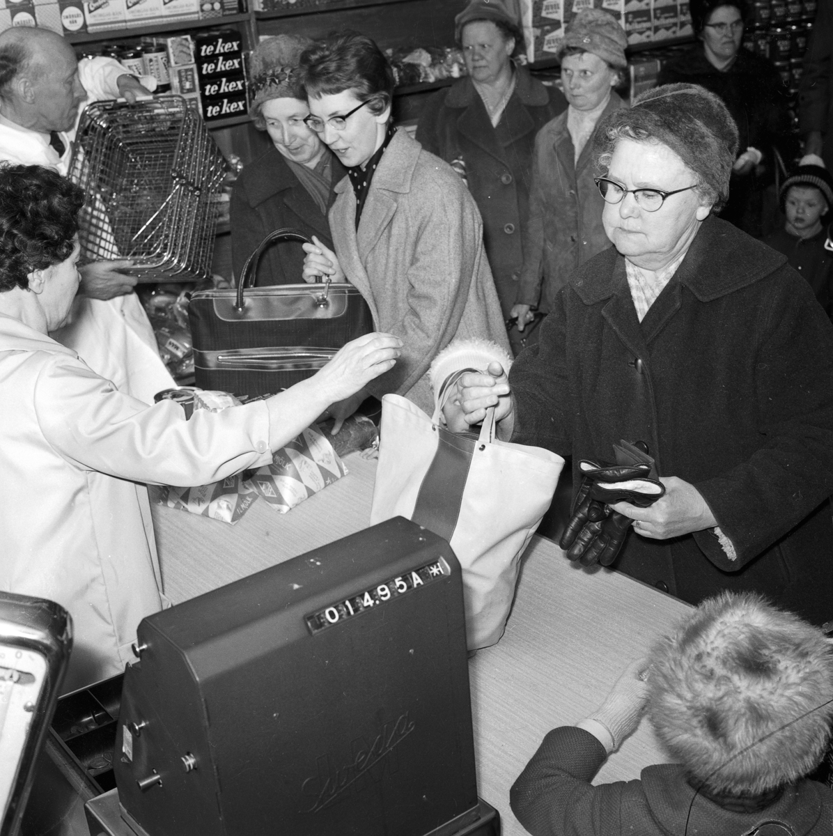 Många kunder väntar på att få handla i den nyöppnade konsum affären.