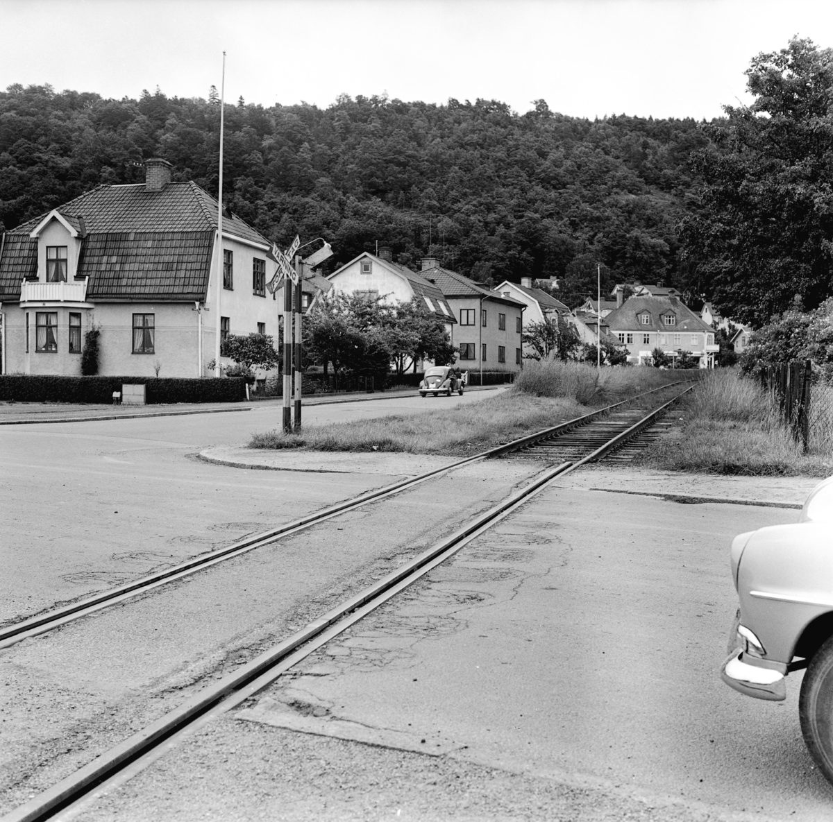 Järnvägsräls i korsningen långgatan och järnvägsgatan.