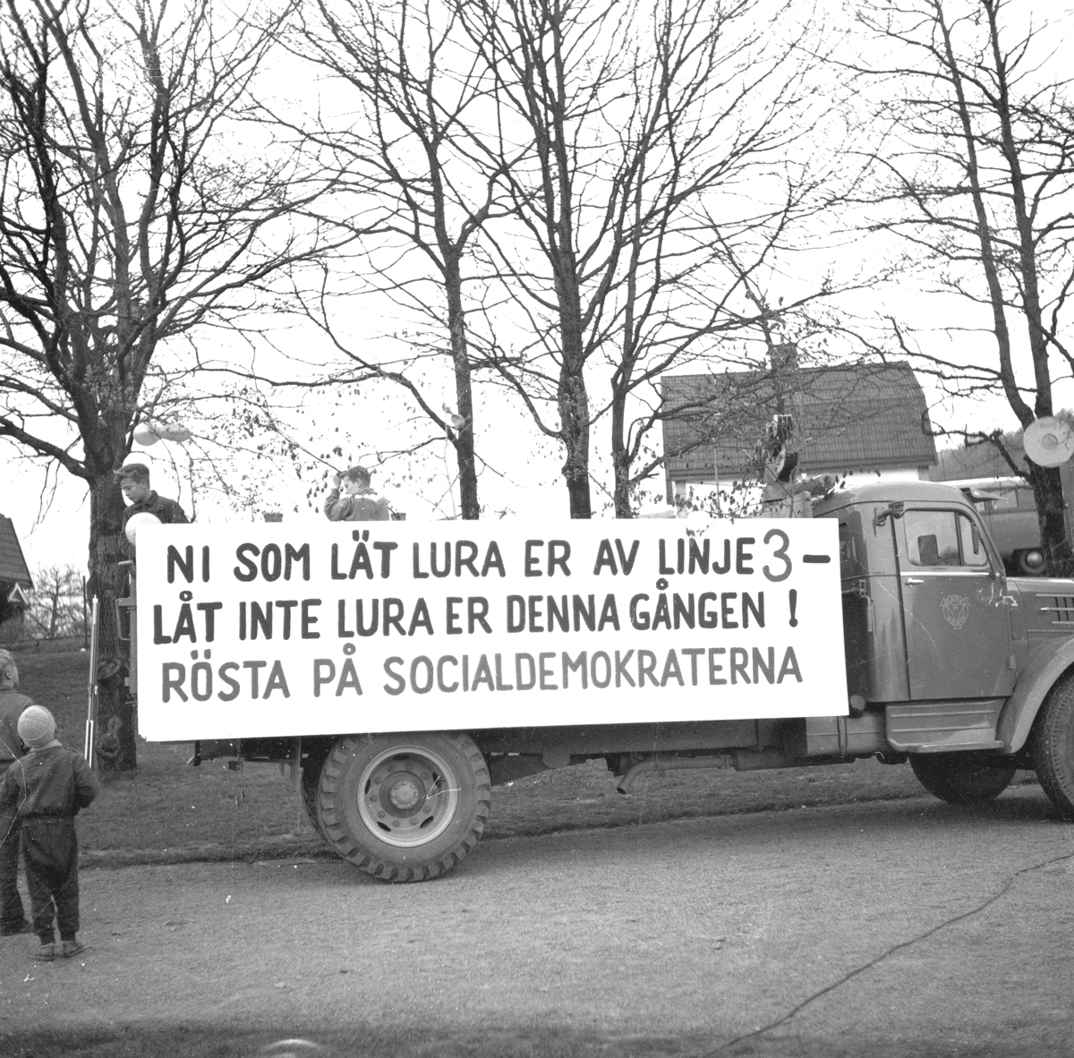 Lastbil med valpropaganda för Socialdemokraterna i Huskvarna.