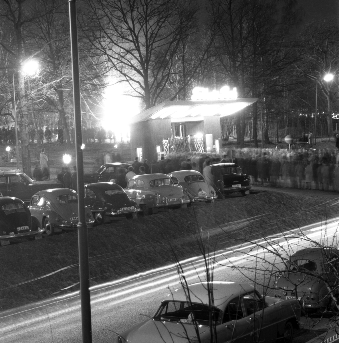 Kö vid den nedre entrén från Folkparksvägen i Huskvarna till Huskvarna Folkets park omkring 1960.