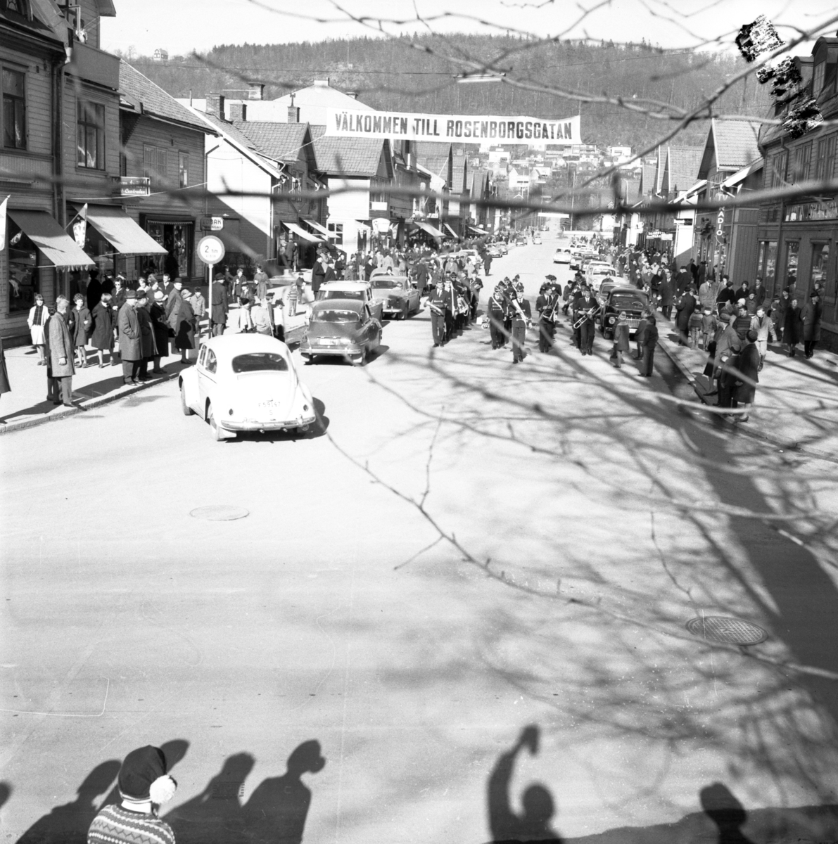 Gossmusikkåren paraderar på Rosenborgsgatan i Huskvarna.