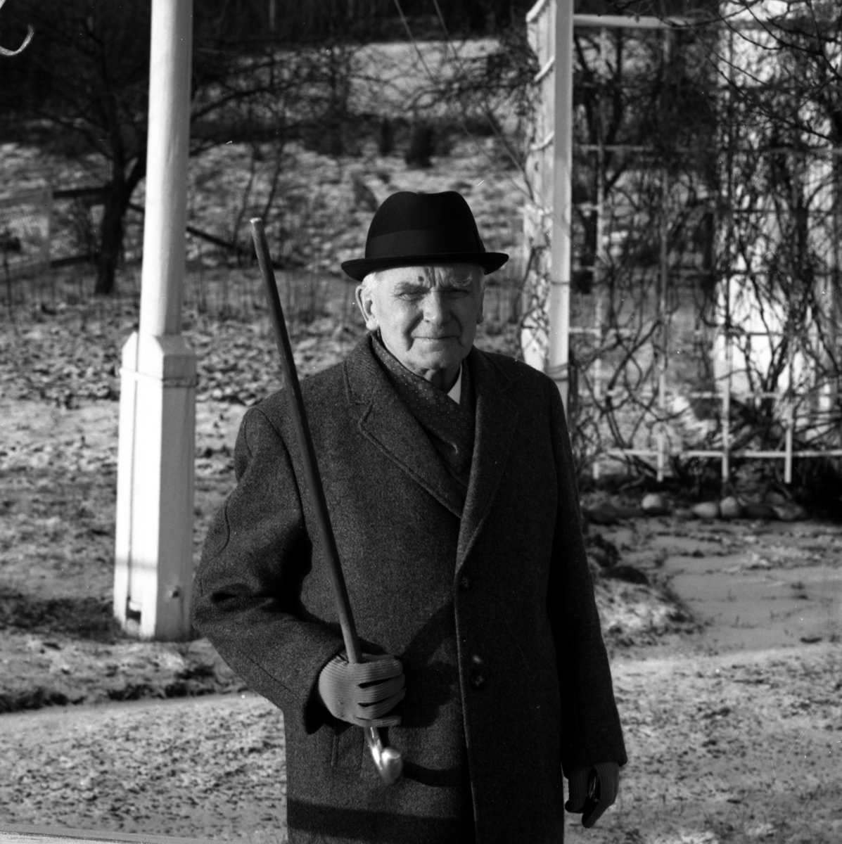 Porträtt av målarmästare Esping utanför bostaden i Lekeryd den 12 januari 1965.