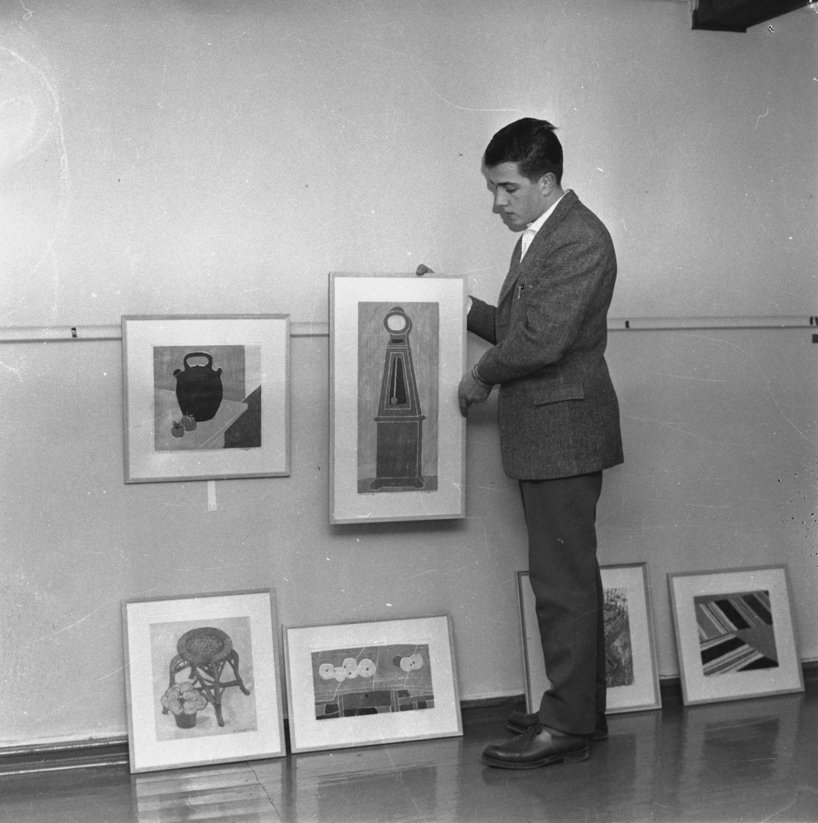 En man hänger tavlor på konstnärsgården i Huskvarna.