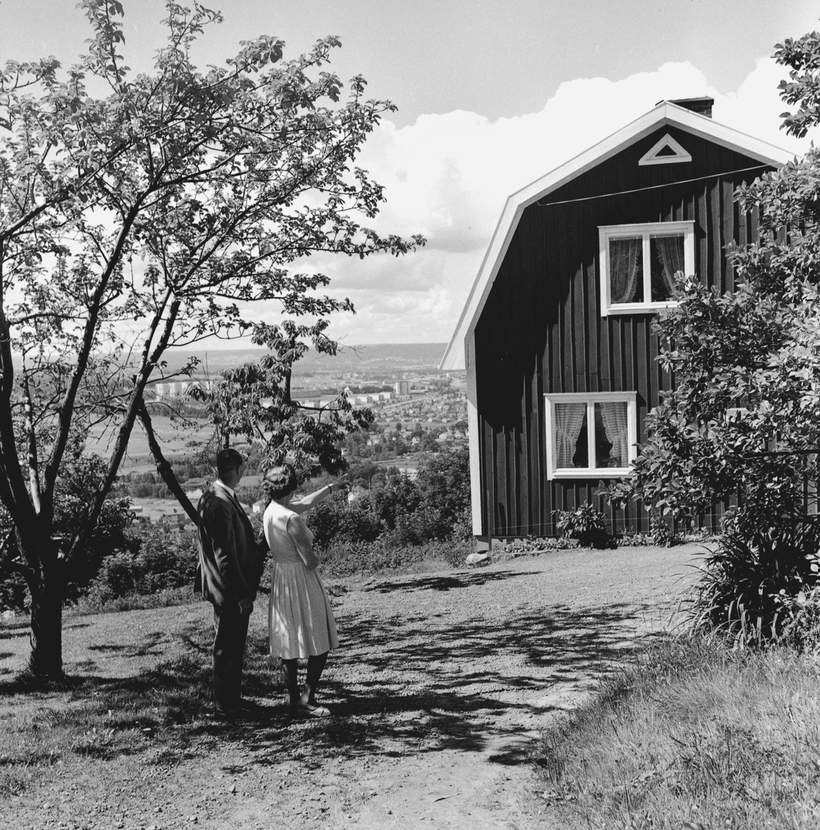 En kvinna o en man står vid ett hus uppe på berget i Huskvarna.