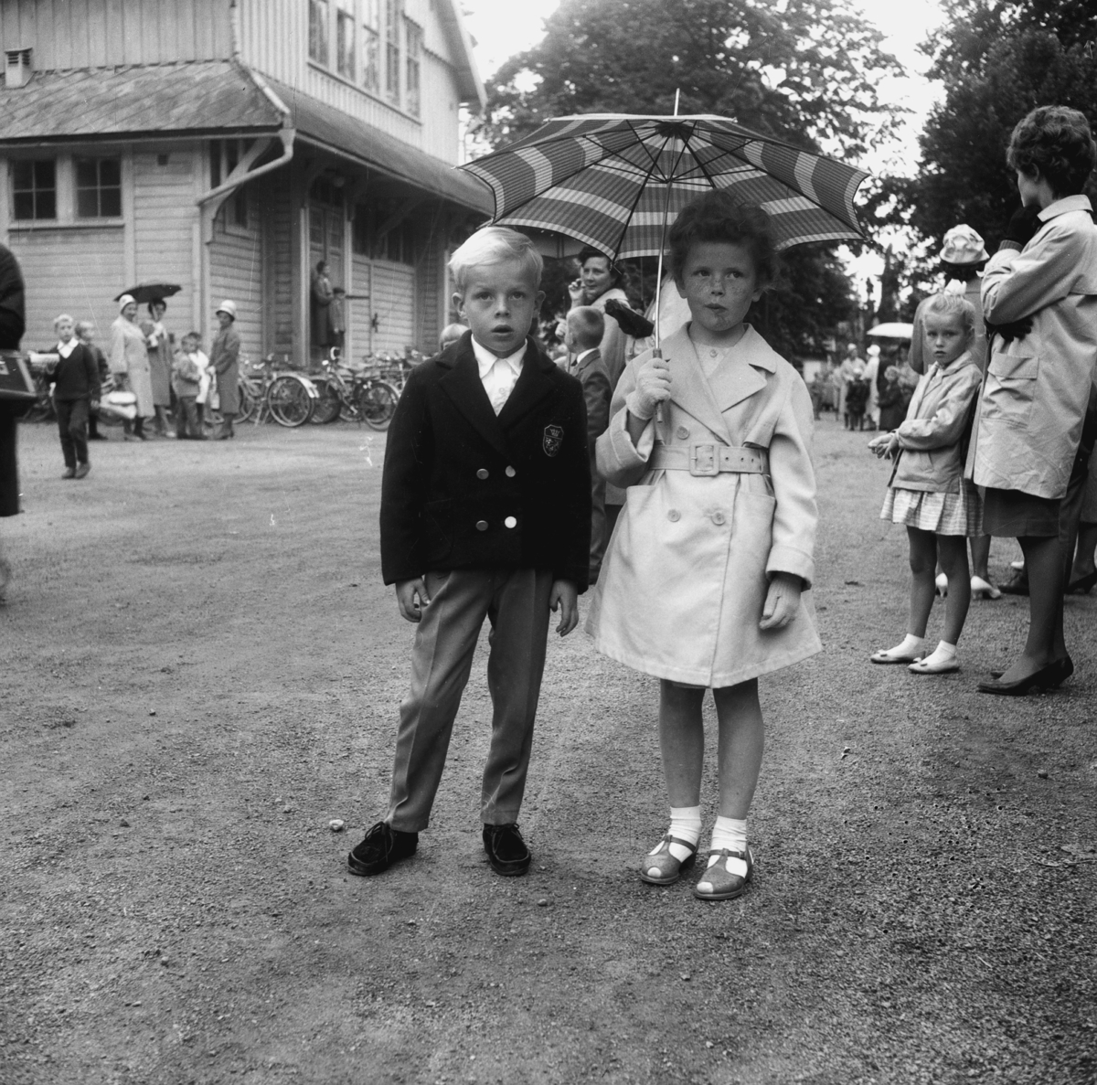 Det är första dagen i skolan och barnen har samlats utanför idrottshuset i Huskvarna.