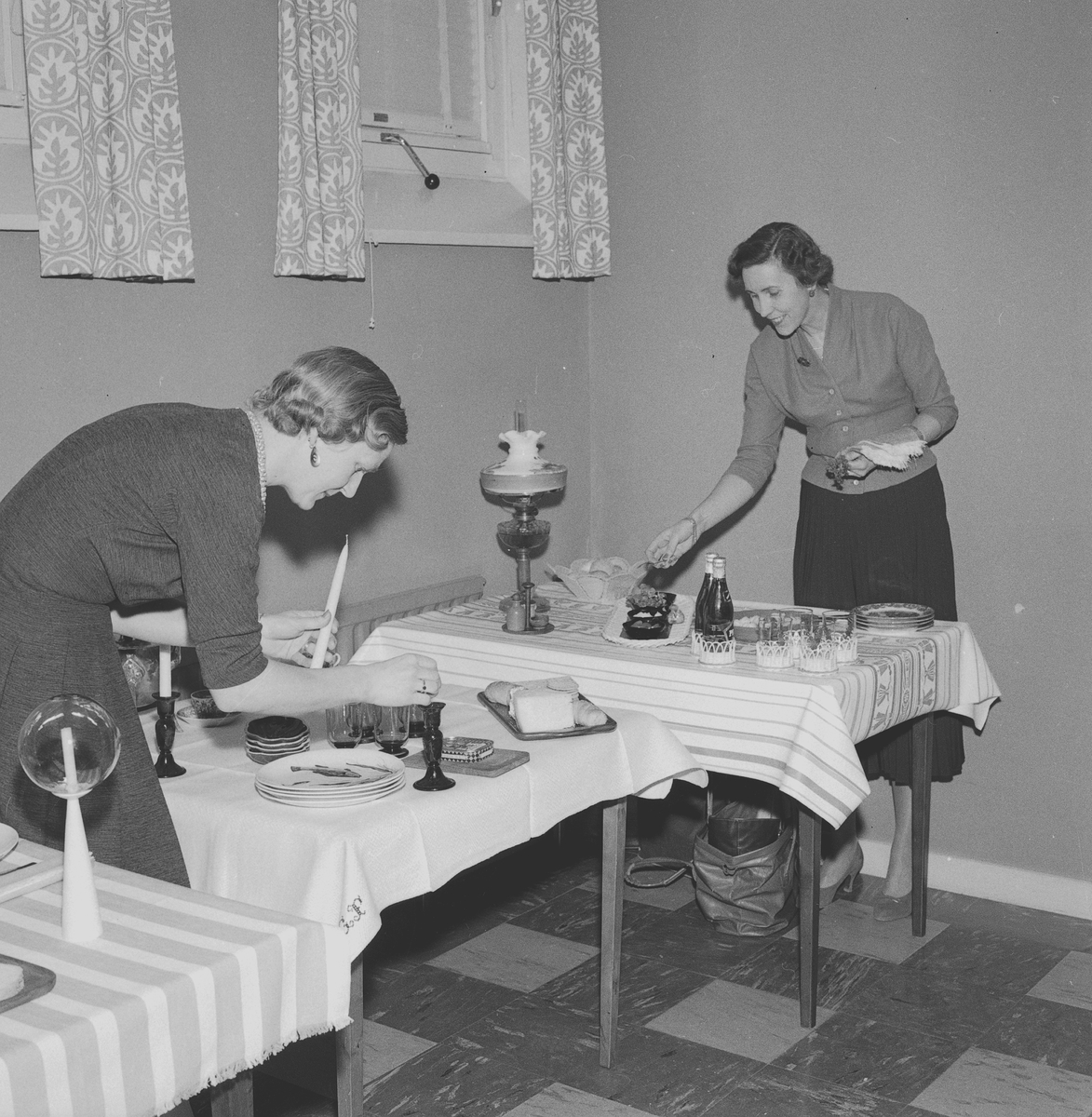 Två kvinnor från Husmodersföreningen dukar borden i Faktorisalen i Huskvarna.