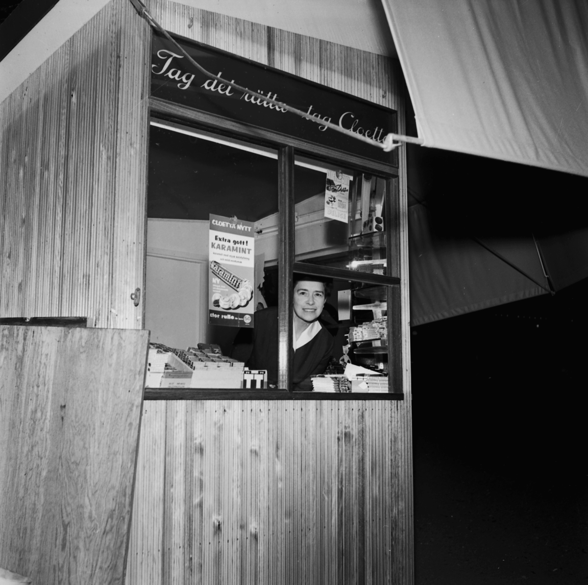 En kvinna står i chokladkiosken i Huskvarnas folkets park.