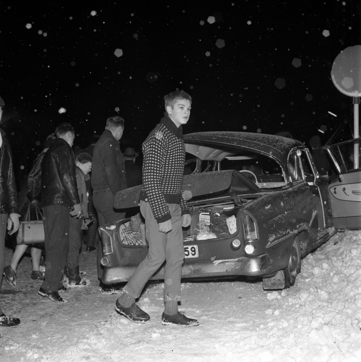Personbil i krock med snöplog i Huskvarna på 1960-talet.