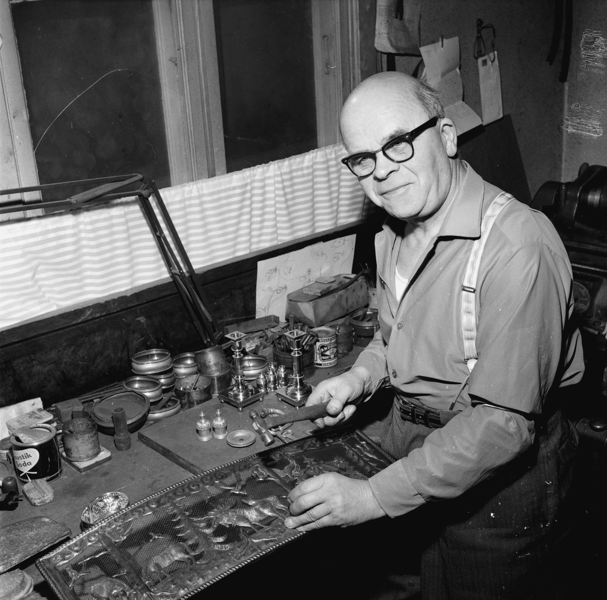 En man sitter vid sin arbetsbänk i Huskvarna den 11 september.