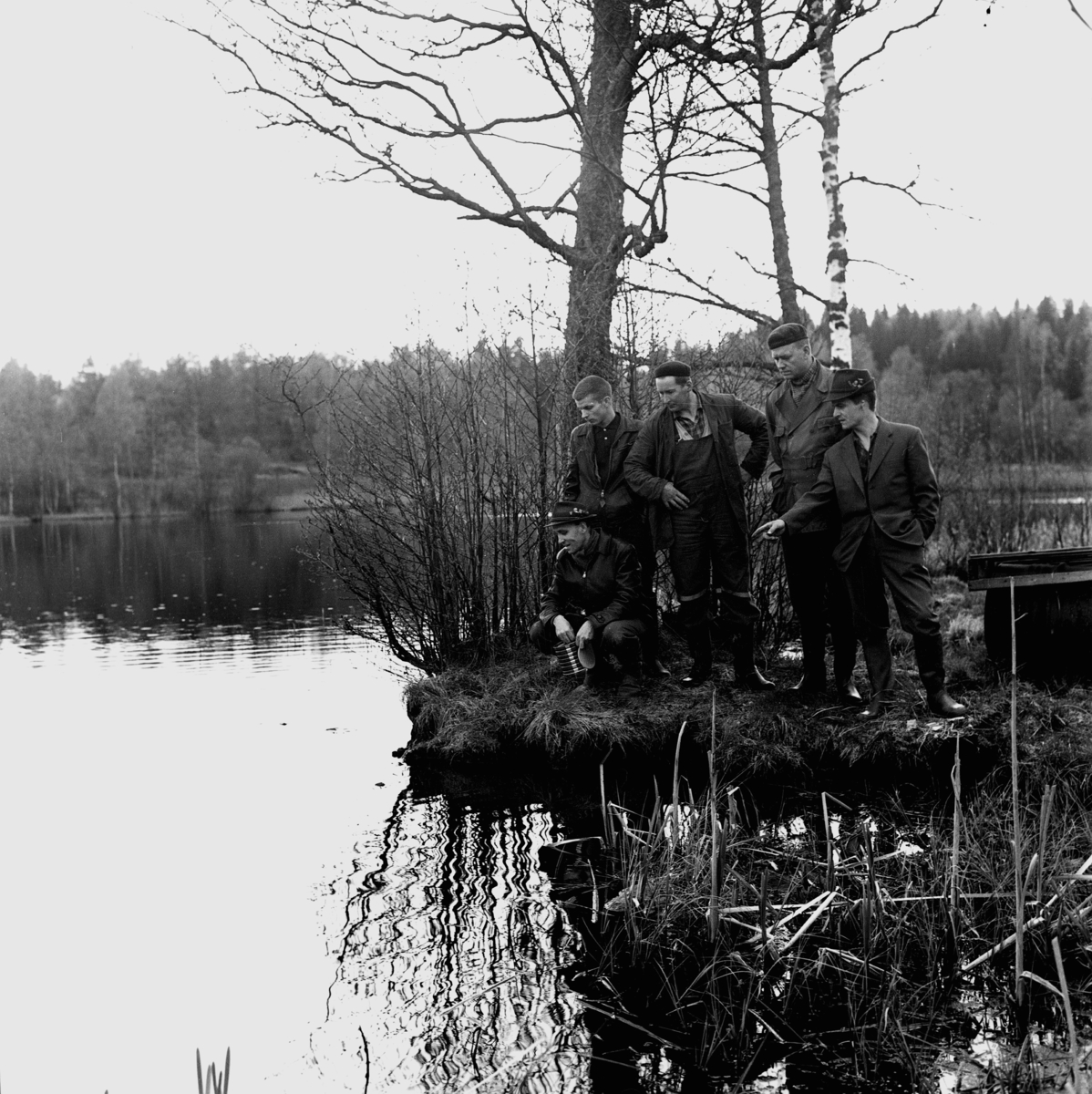 En grupp med män håller på med fiskodling i Läxarpagölen utanför Huskvarna.