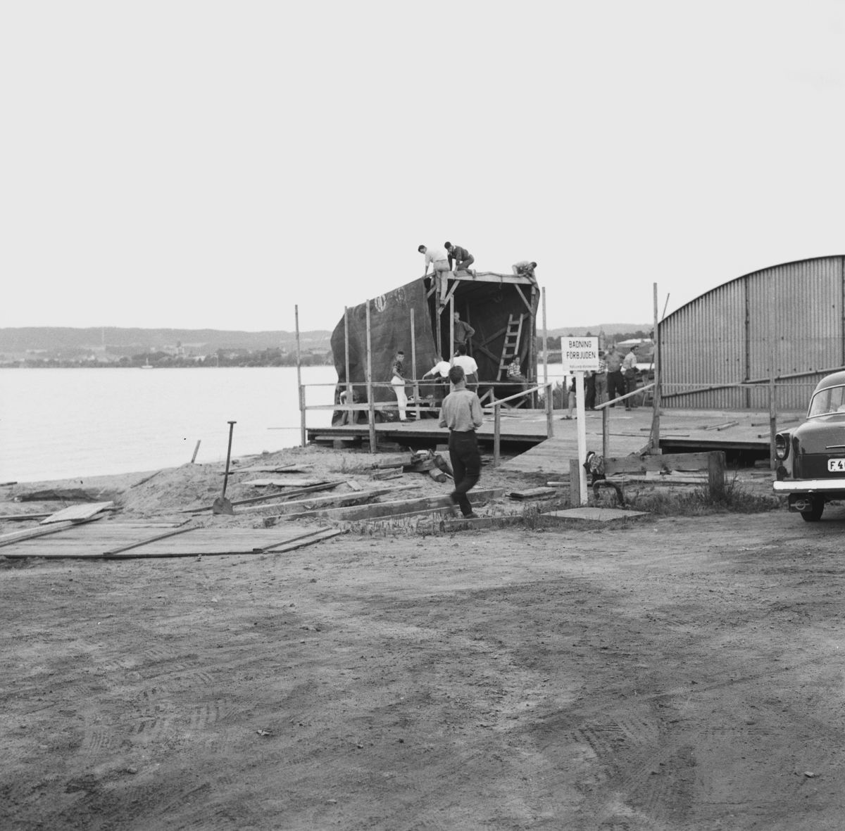 Medlemmar från Jönköpings kanot klubb bygger en dansbana för fest den 29 juli.