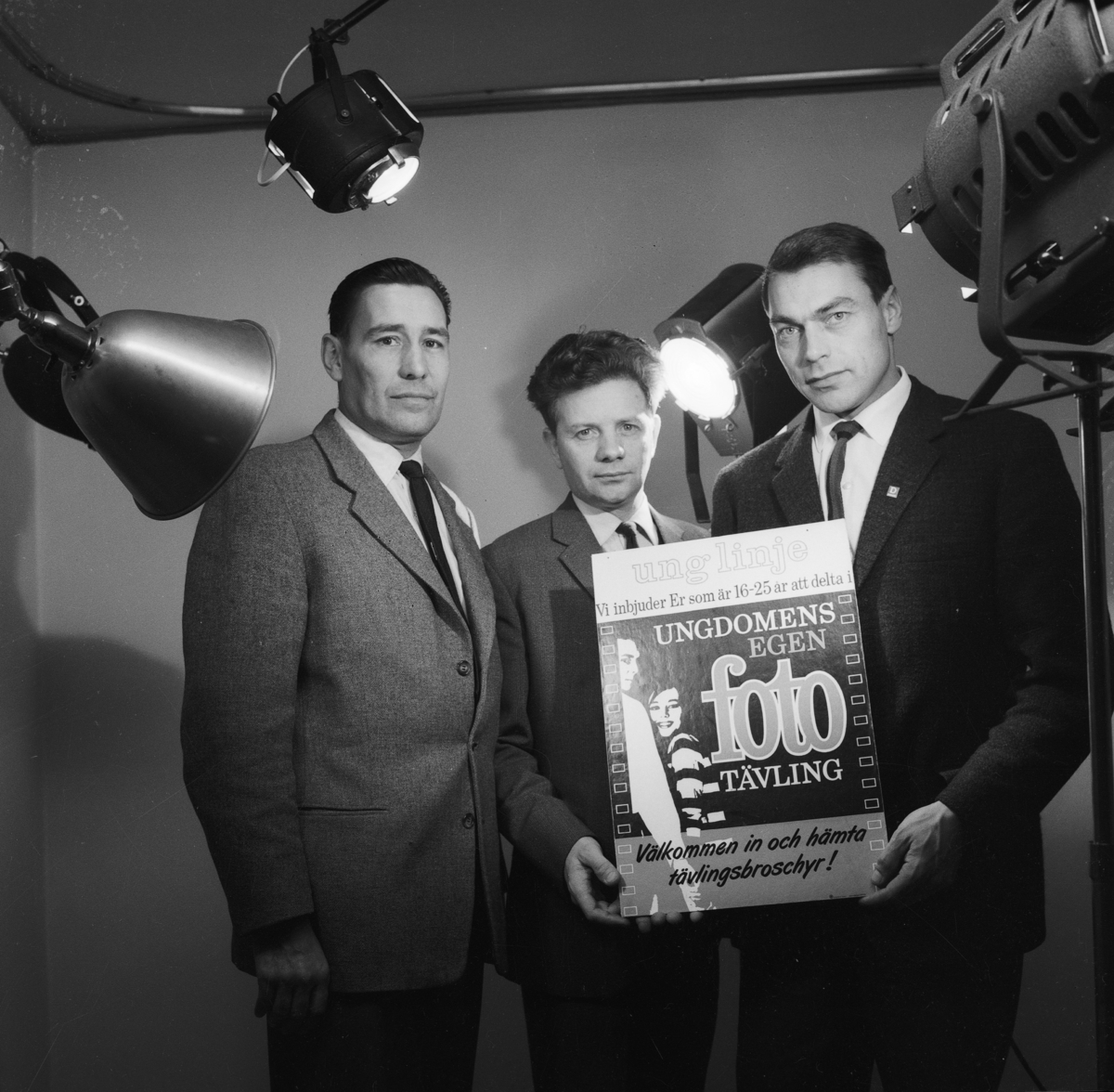 Tre män visar en skylt om Ungdomens Fototävling på Domus.