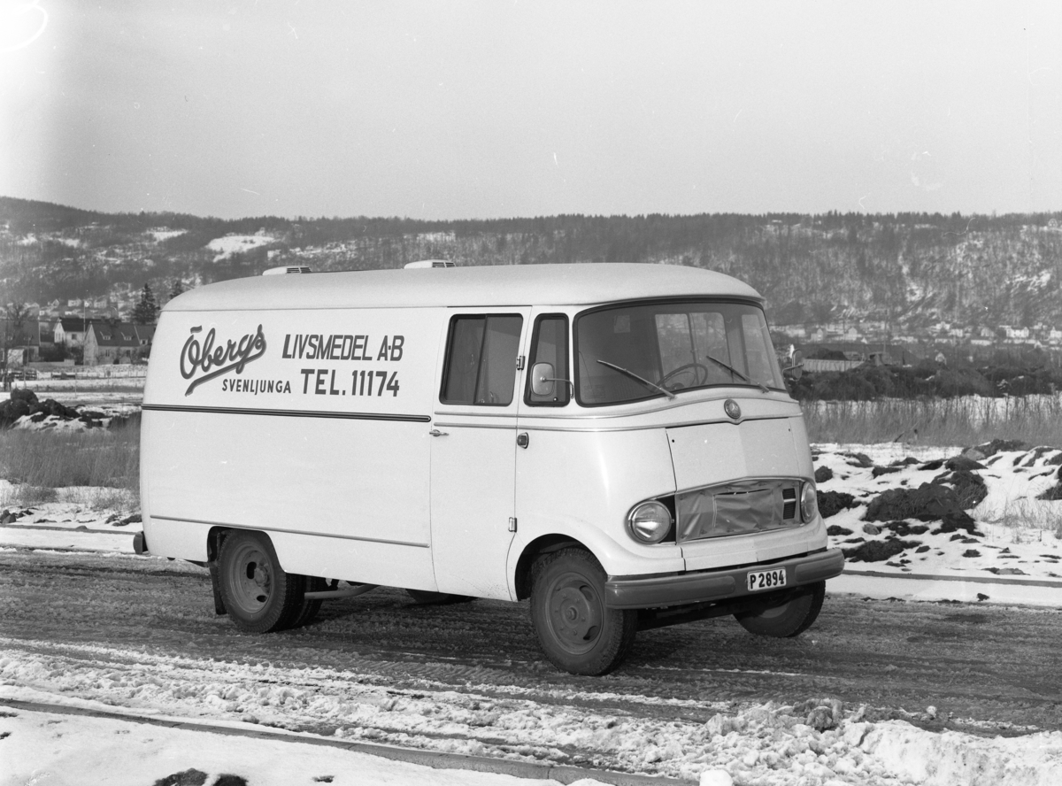 Reklambild för ECO Annonsbyrå gällande Öbergs Livsmedel AB i Svenljunga den 4 mars 1964. Fordon av märket Mercedes.