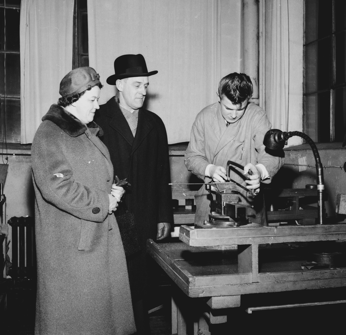 Ett par står och tittar när en elev på Huskvarnas lärlingsskola arbetar.