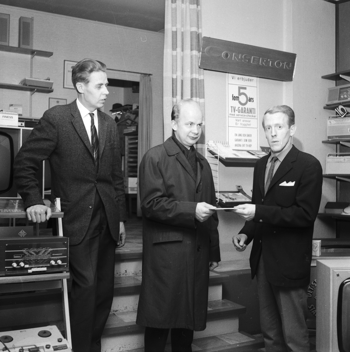 Tre män i radio och TV affären. Från vänster ägaren Edel Persson (1), "Tvilling" Andersson (2), Herr Larsson (3).