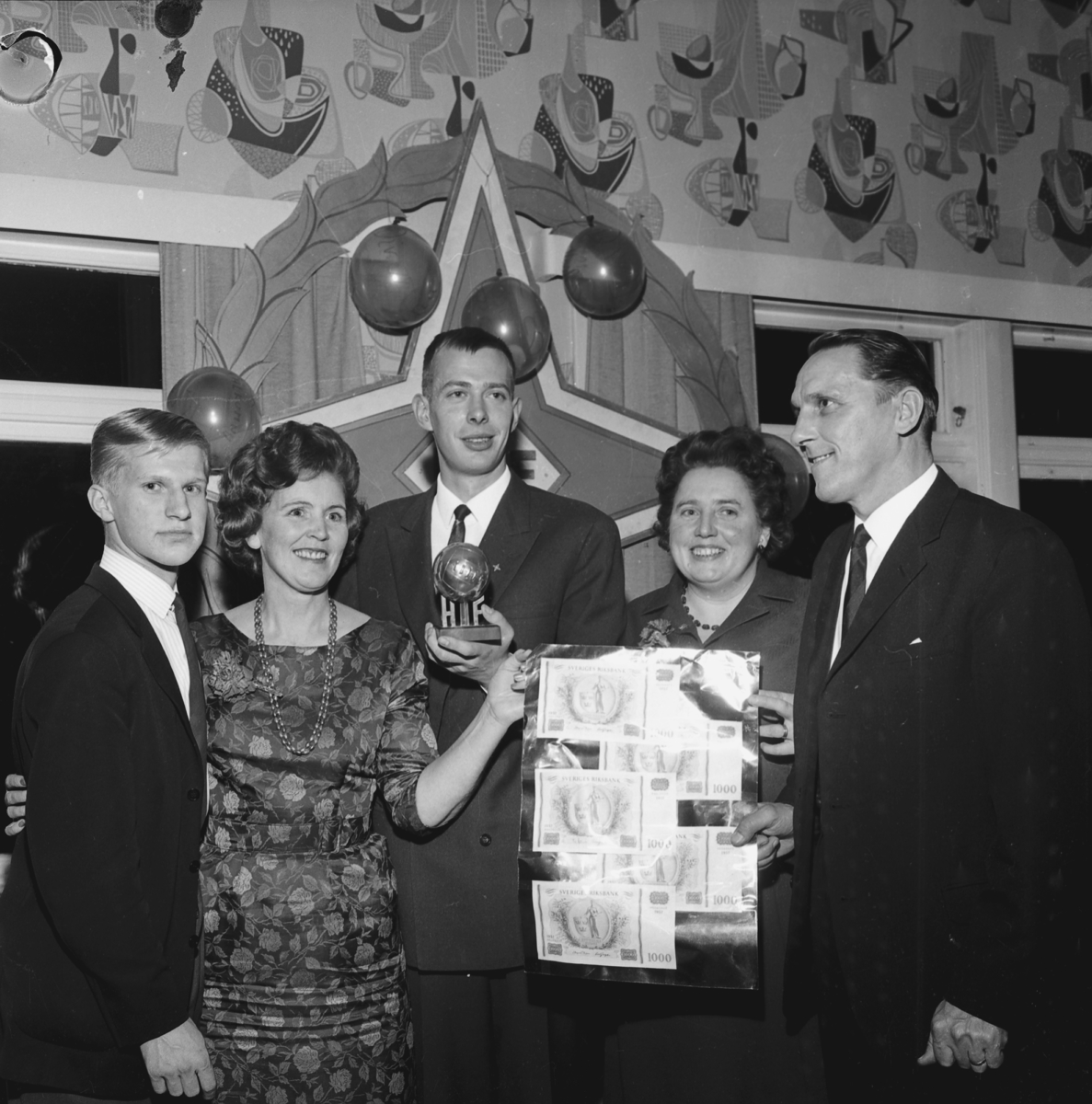 Gunvi Pettersson, ordförande för HIF:s damklubb, överlämnar pengar till huvudstyrelsens ordförande från höger Olof Lindström (1).