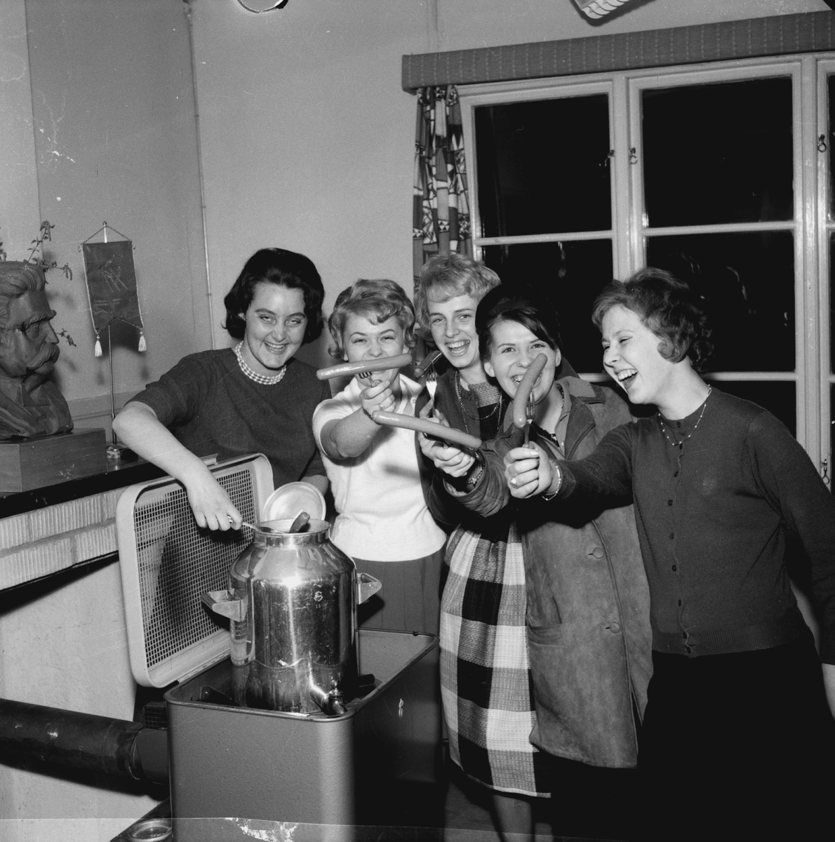 Socialdemokratiska ungdomsklubben SSU är i sommarhemmet på Vista kulle, utanför Huskvarna. Fem unga kvinnor kokar korven i kaffebehållaren.