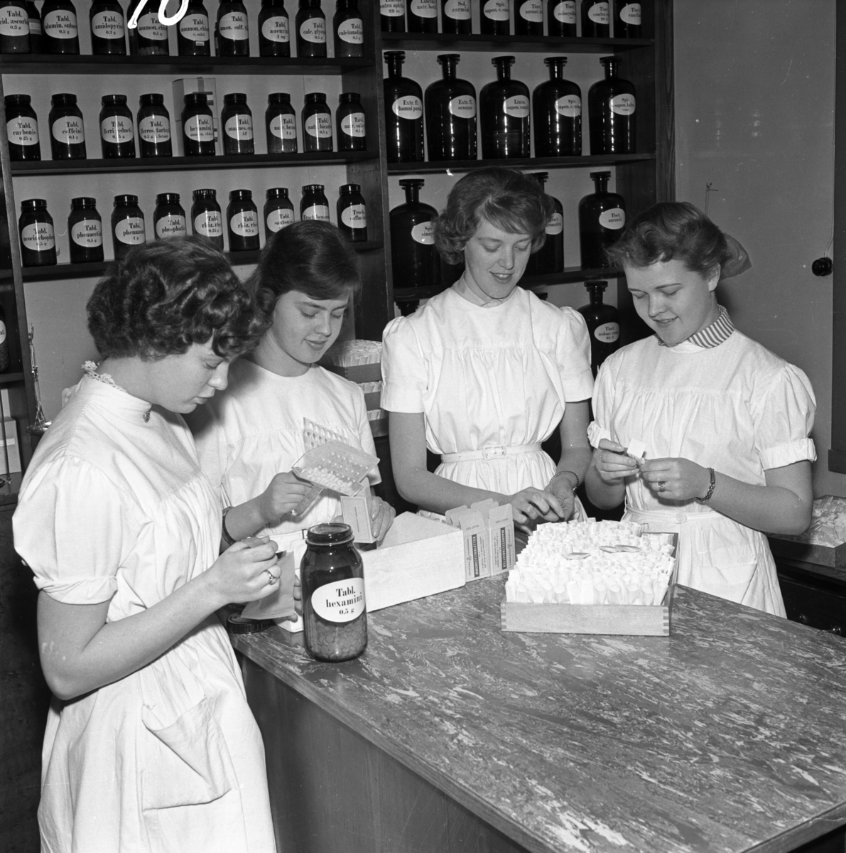 Personalbild vid tillverkning av Doktor Hjortons pulver "en sippa" på Apoteket i Huskvarna på 1950-talet.