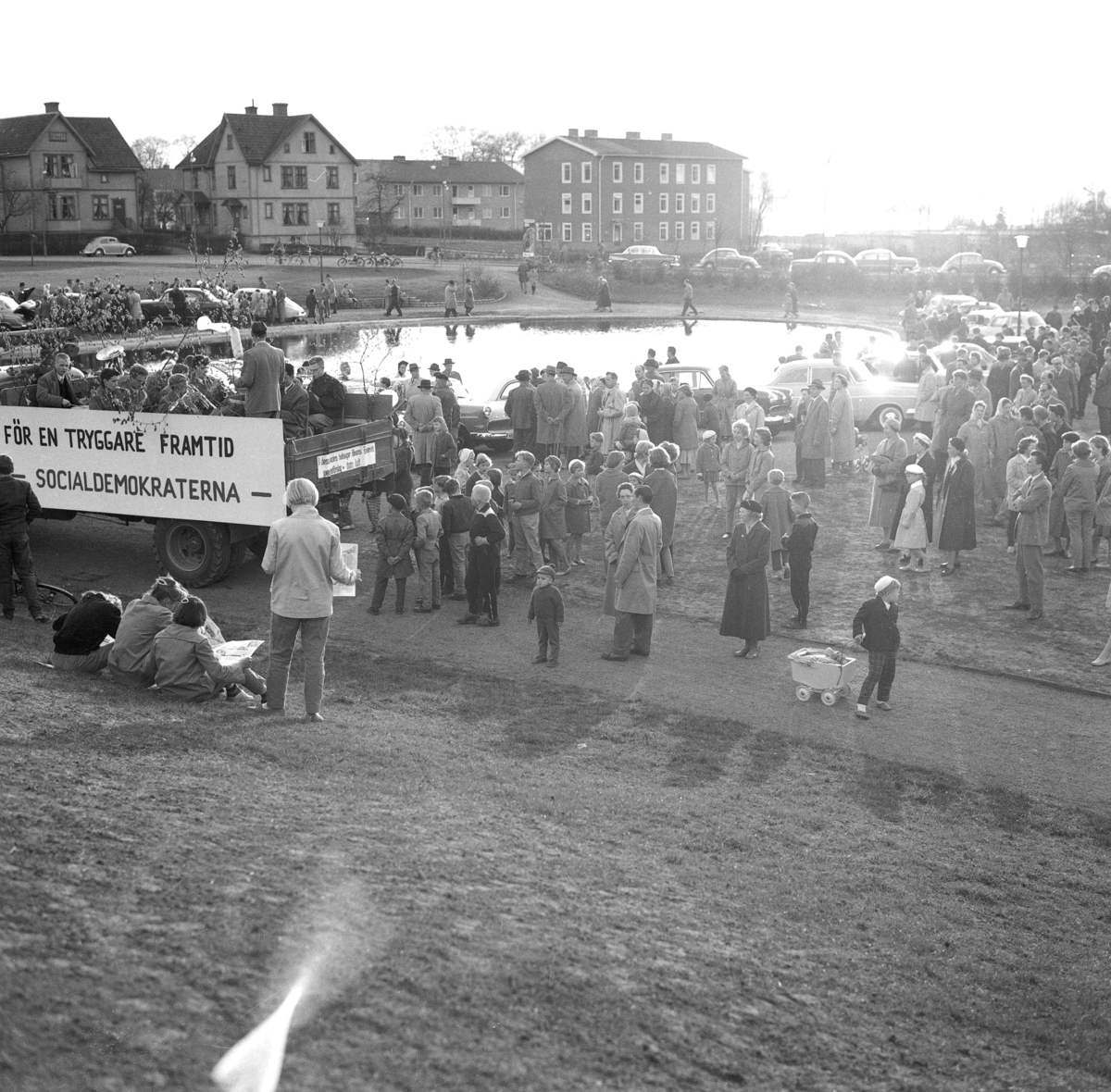 Bilparad i Mjölkafållan i Huskvarna. Det är valtider och på plakatet står det " För en tryggare framtid Socialdemokraterna"