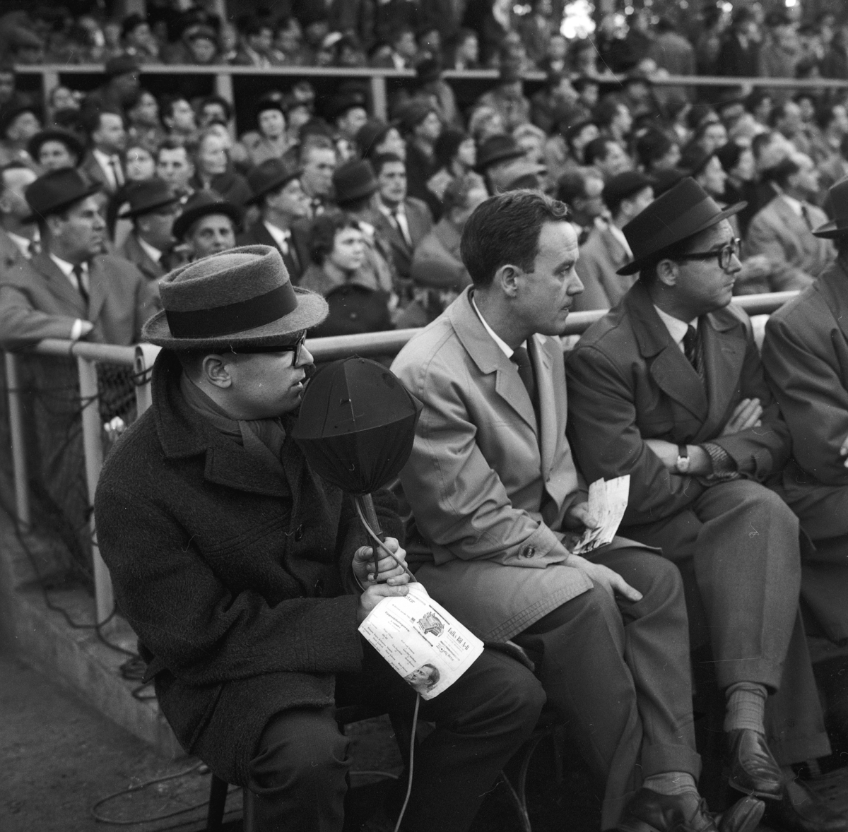 En man sitter och referar fotbollsmatchen mellan Jönköping södra (J-södra) och Huskvarna idrottsförening (HIF) på Stadsparksvallen i Jönköping.