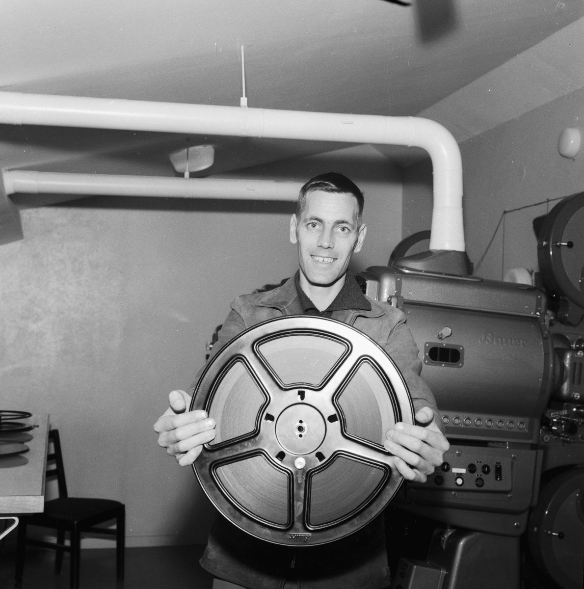 Arne Frille) Andersson står framför filmprojektorn och håller i en filmrulle på biografen Arcadia i Huskvarna.