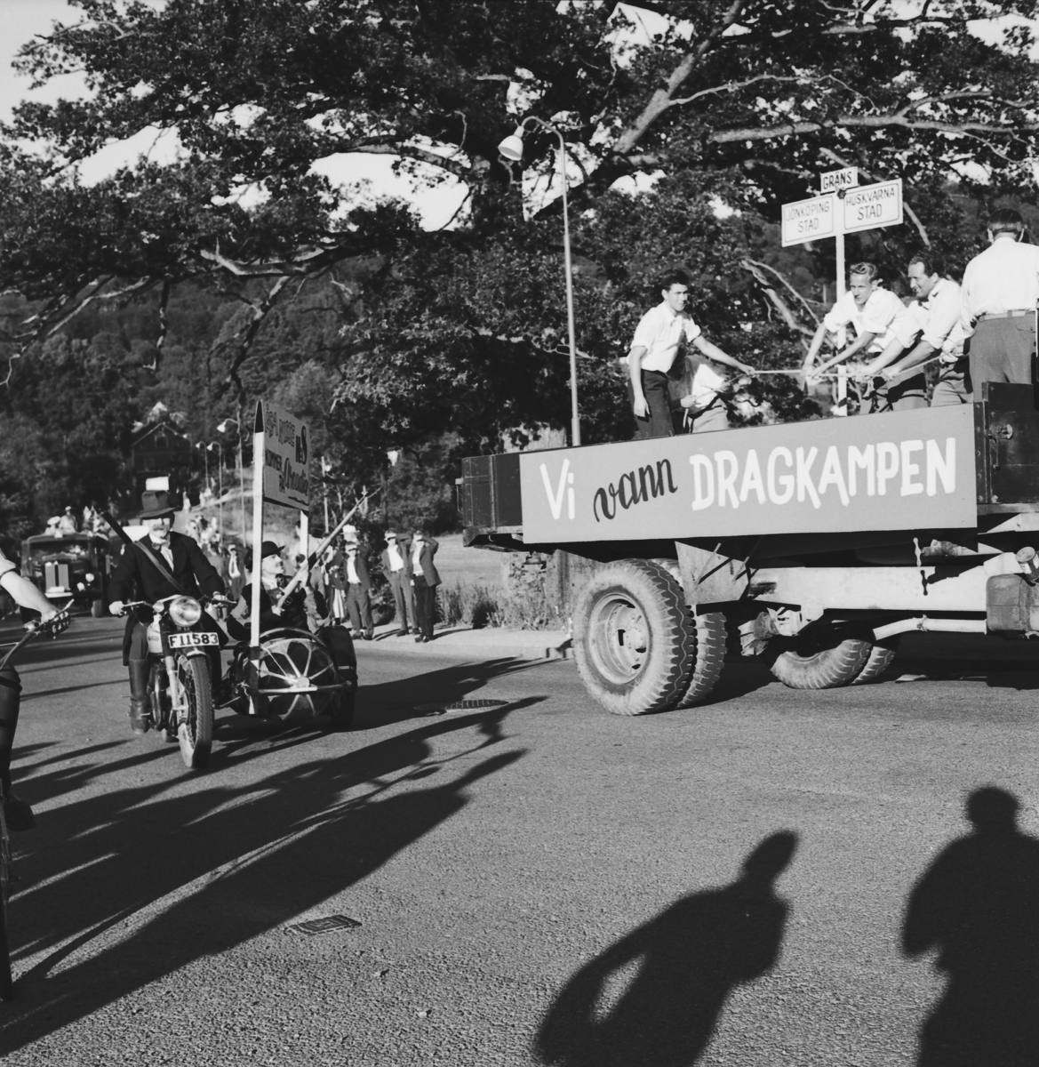 Stora träffen. En parad på Faktorigatan i Huskvarna, med vagnar med olika budskap på skyltarna.