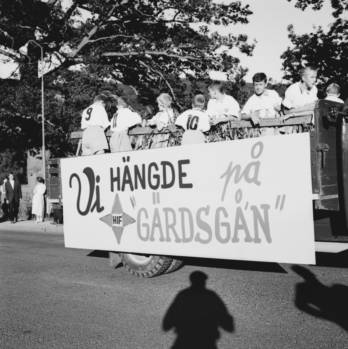 Titel: Stora träffen. En parad på Faktorigatan i Huskvarna, med vagnar med olika budskap på skyltarna.
