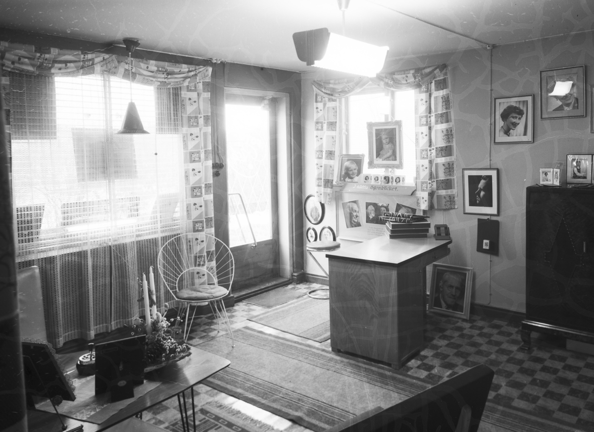 Fotograf Conny Rich fotoateljé på Jönköpingsvägen 33 i Huskvarna. På golvet under bordet står ett fotografi av Conny Rich farfar.