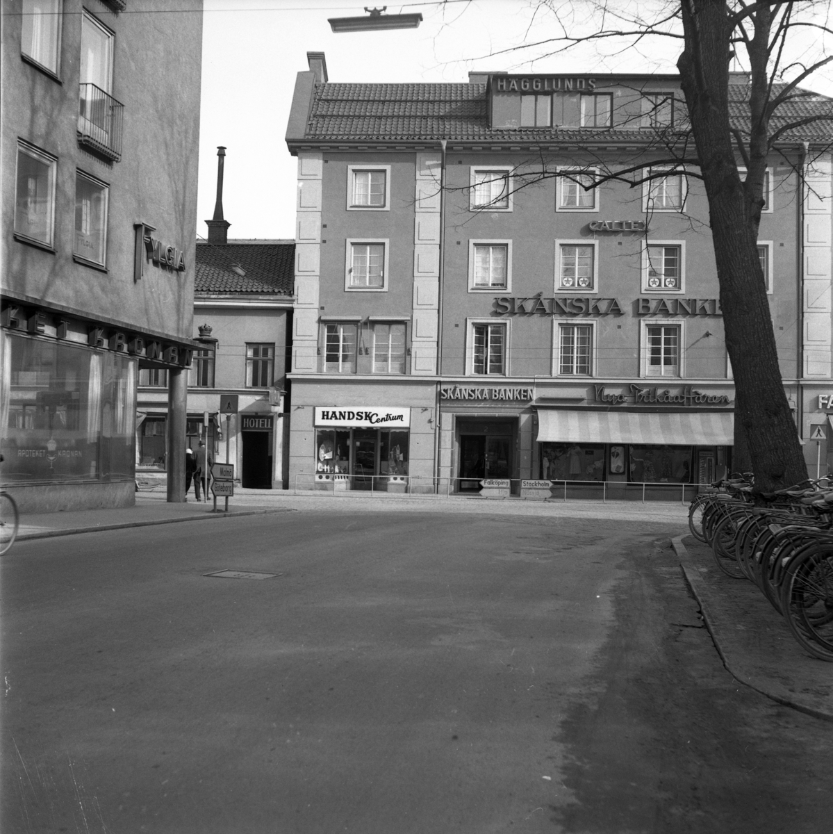 Neonskyltar för Apoteket Kronan, Hotell, HandskCentrum, Skånska Banken och Nya Trikåaffären lyser upp korsningen Kyrkogatan - Västra Storgatan i Jönköping den 9 april 1958.