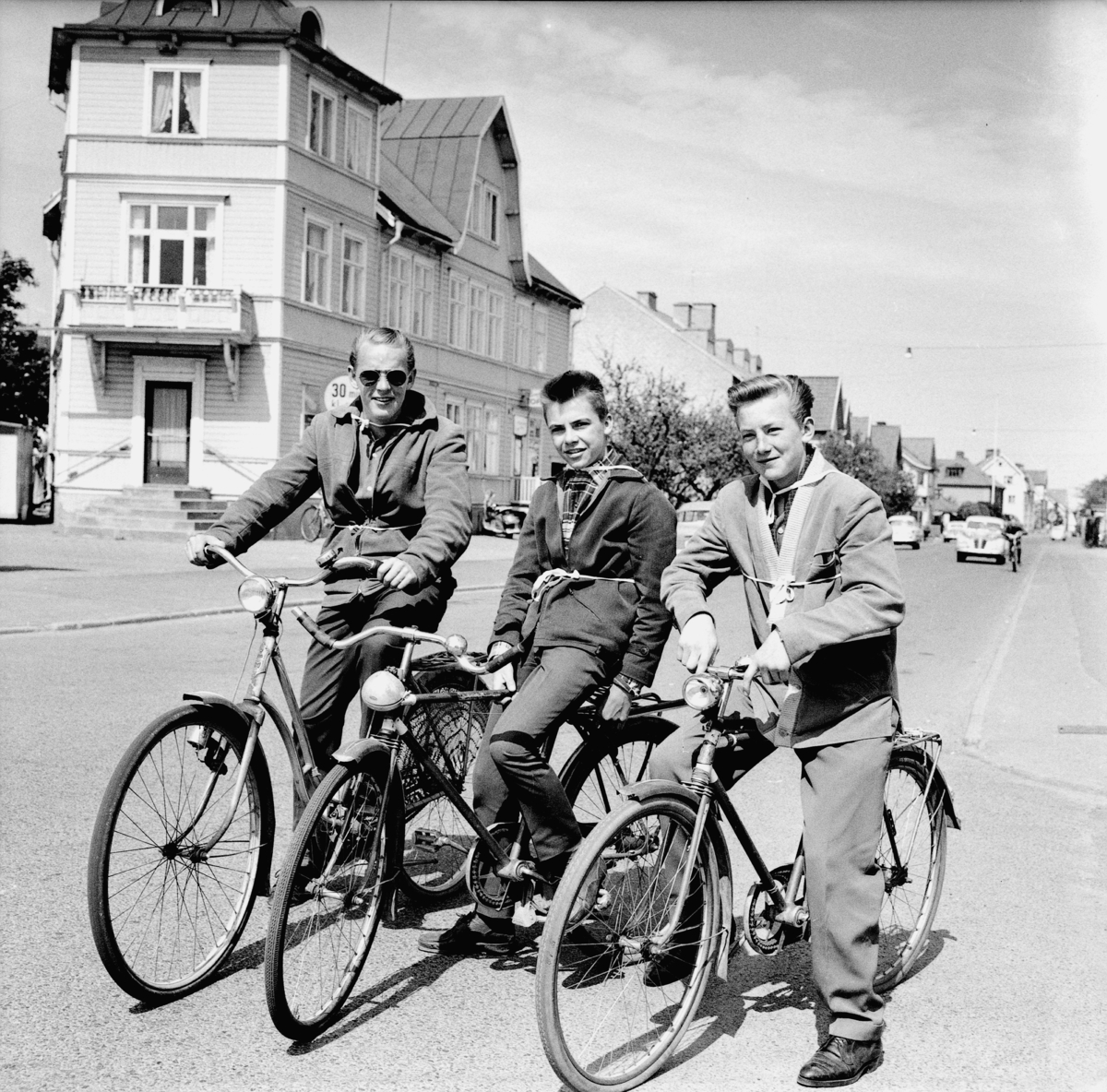 Tre cyklande pojkar vid Cittran på Vättergatan i Huskvarna i slutet av 1950-talet . Namnet på pojkarna är Jonny Carlsson, Lars Pihlkvist och Kenneth Johansson.
