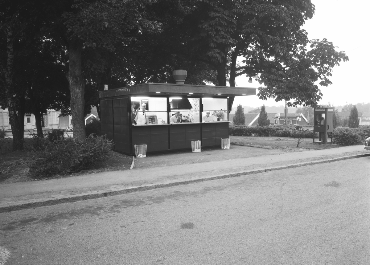 En korvkiosk vid Hakarpsvägen i Huskvarna genom fönstren kan man se ägaren Tage Mårdskog och två anställda.