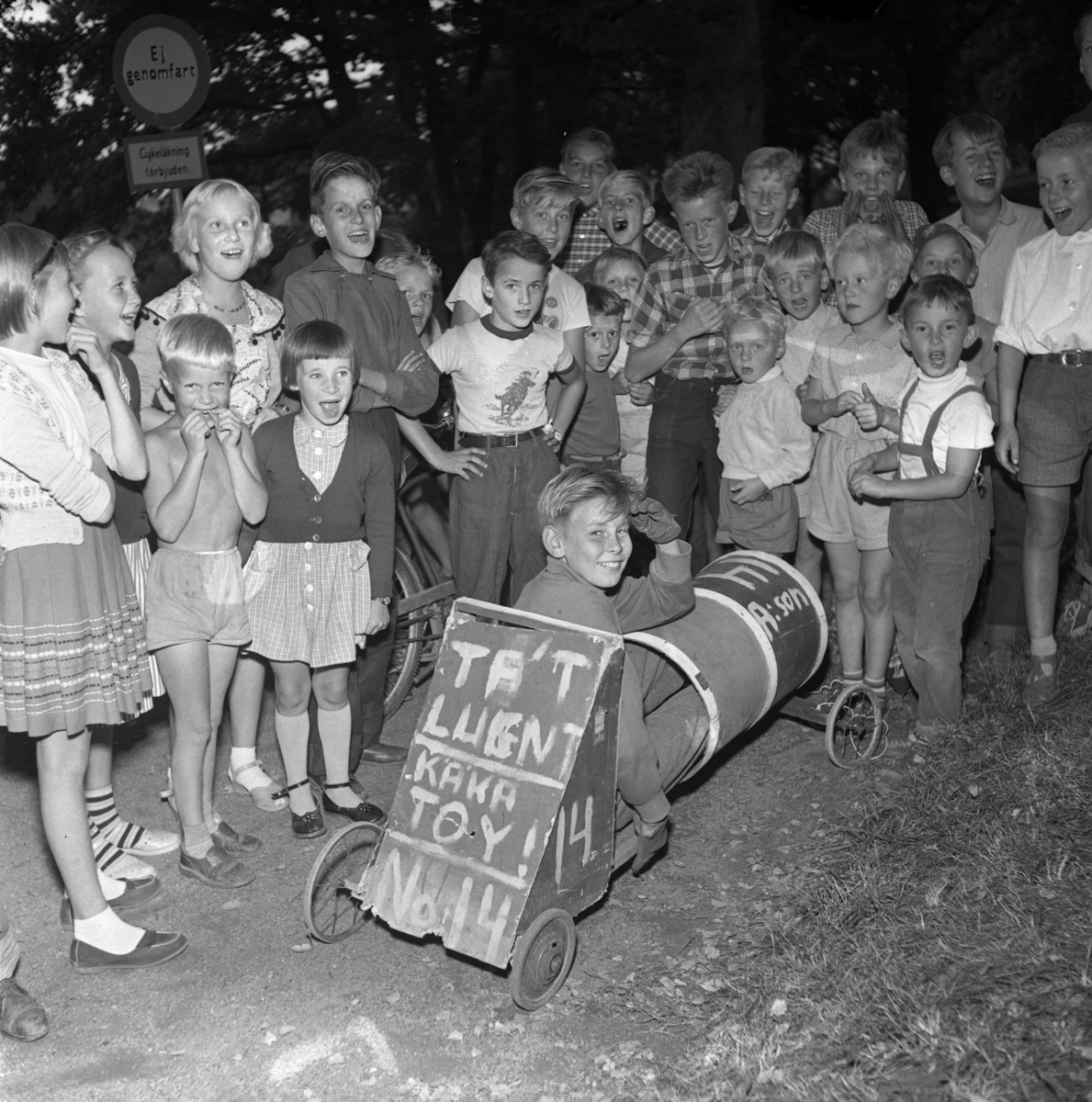 Lådbilsrally i Huskvarna stadspark den 10 oktober 1955. Barnen åkte från "Kransaträdgården" den smala vägen ned genom stadsparken. Här är målgången vid södra änden av Bergsgatan. Bil nr 14 med föraren Gunnar Forsberg har till och med reklam för tuggummit Toy på bilen.