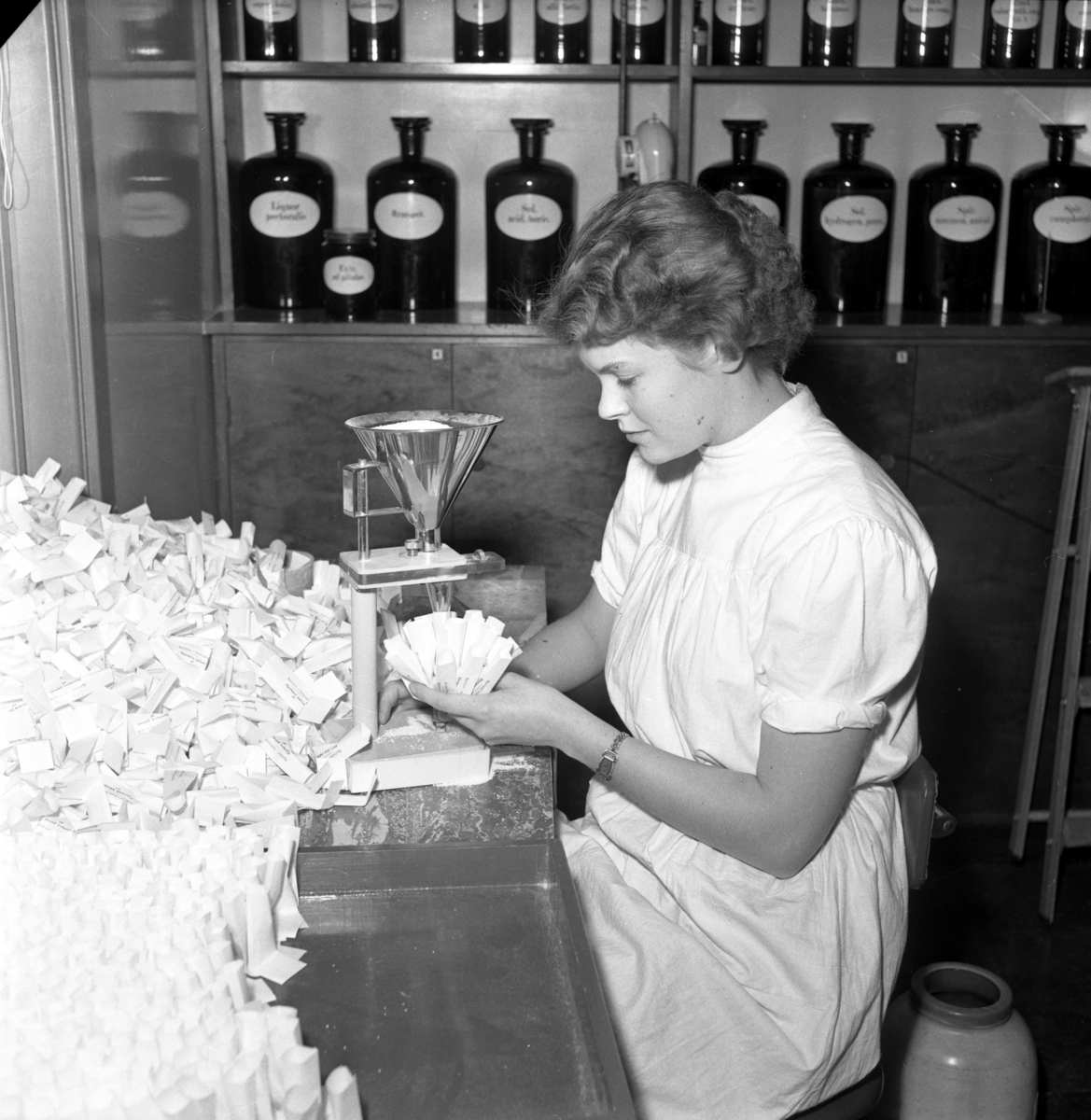 På apoteket på Rosenborgsgatan i Huskvarna sitter Yvonne Eriksson och fyller på förpackningar med doktor Hjortons pulver. Det framställdes för att motverka spanska sjukan, men kom att användas av många arbetare på Husqvarna AB som ett uppiggande medel. Med tiden visade det sig vara beroendeframkallande och kunde orsaka allvarliga skador på bland annat njurar och lever.