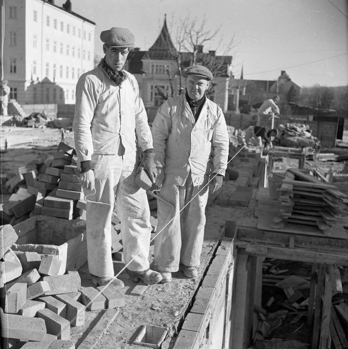 Två murare vid bygget av Kanalgatan 40 i Jönköping. Från vänster: "Kalle Timpa" Simonsson, och murare "Putte" Berggren, son till byggmästare Berggren (i firman Knutsson & Berggren). Det lilla huset rakt fram är Svenska Mosskulturföreningen vid Föreningsgatan.