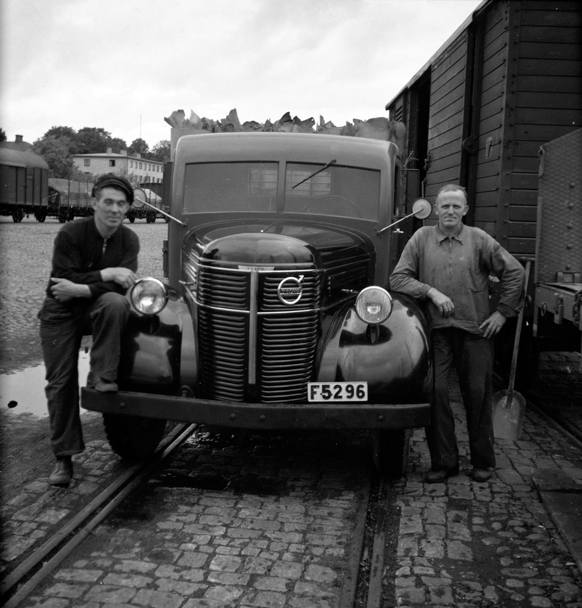 Två män vid en lastbil av märket Volvo. Mannen till vänster körde även för Gasverket. Mannen till höger heter Sandberg. De står vid Hamnstation, vid inre hamnen i Munksjön i Jönköping. Lantmäteriets fastighet vid Skolgatan syns i bakgrunden.