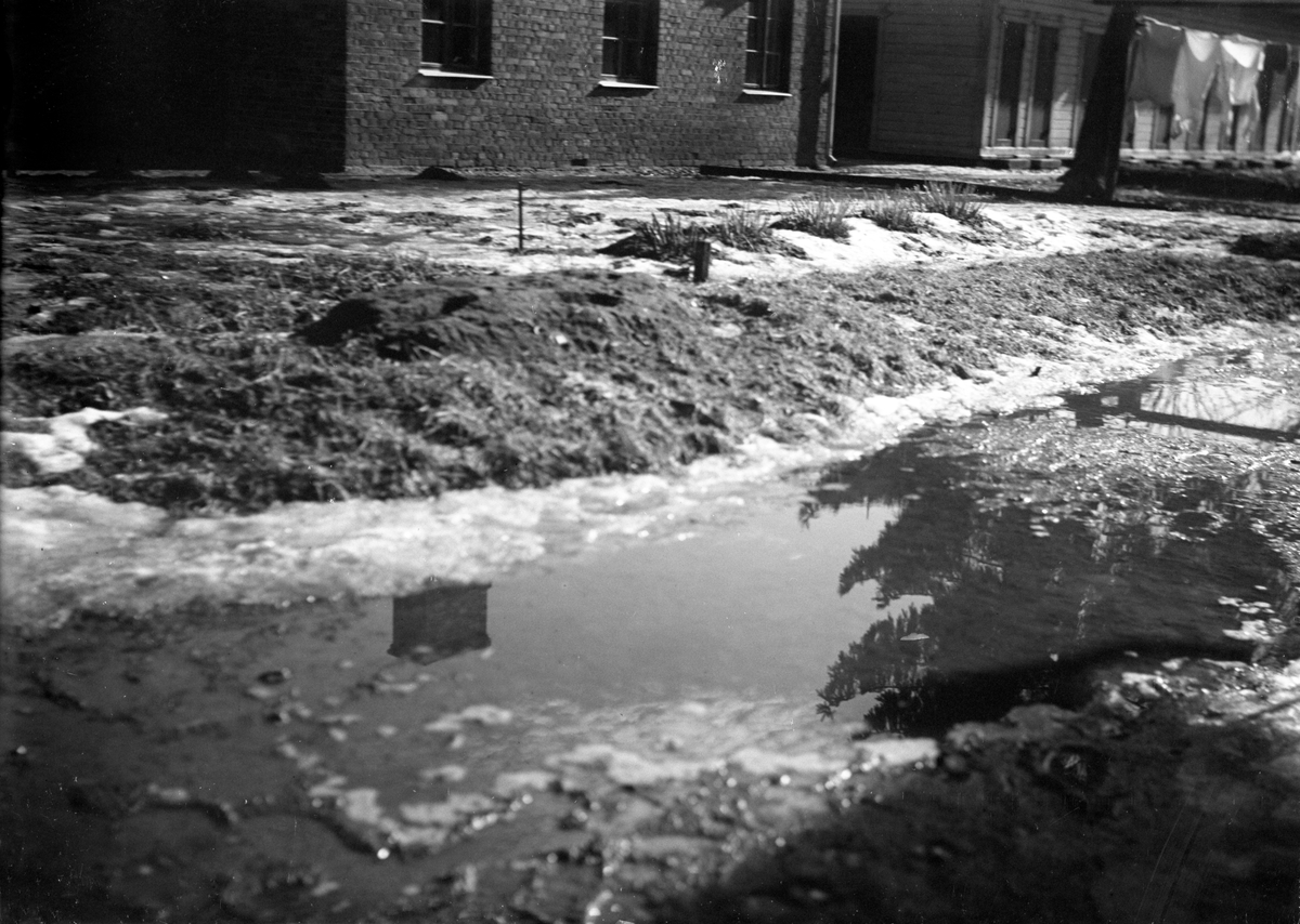 Bostadshus i Jönköping, de så kallade Bostäderna, med vatten från smältande is i förgrunden. Fotograf Gustav Andersson bodde där en stor del av sitt liv.