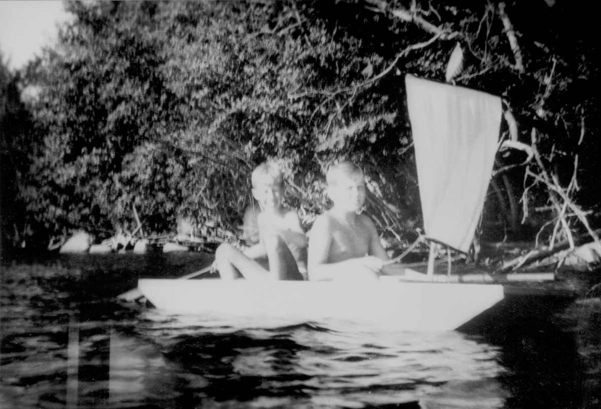 Två pojkar seglar i en dinge på Vättern nedanför Vistakulle, Huskvarna.