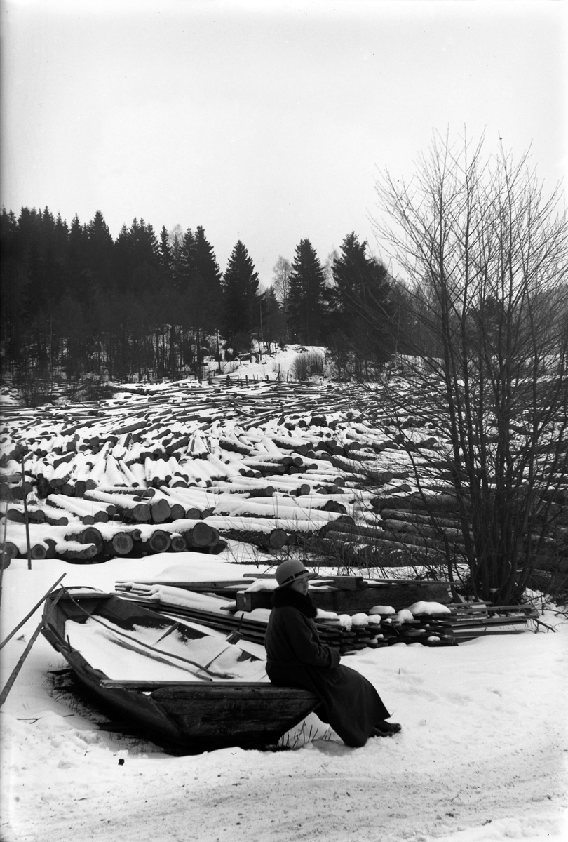 Alma Häger sitter på en eka vid Sjölandet, i bakgrunden en mängd översnöade stockar.