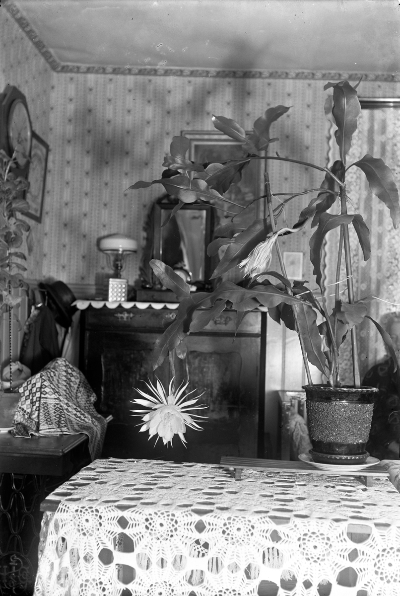 Hos Jungbergs, på ett bord med virkad duk, står en blommande Nattens drottning.
