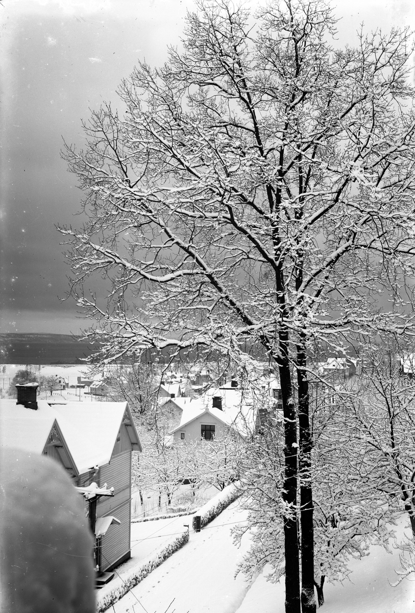 Vinterbild från Huskvarna med bostadshus och ett träd i förgrunden.