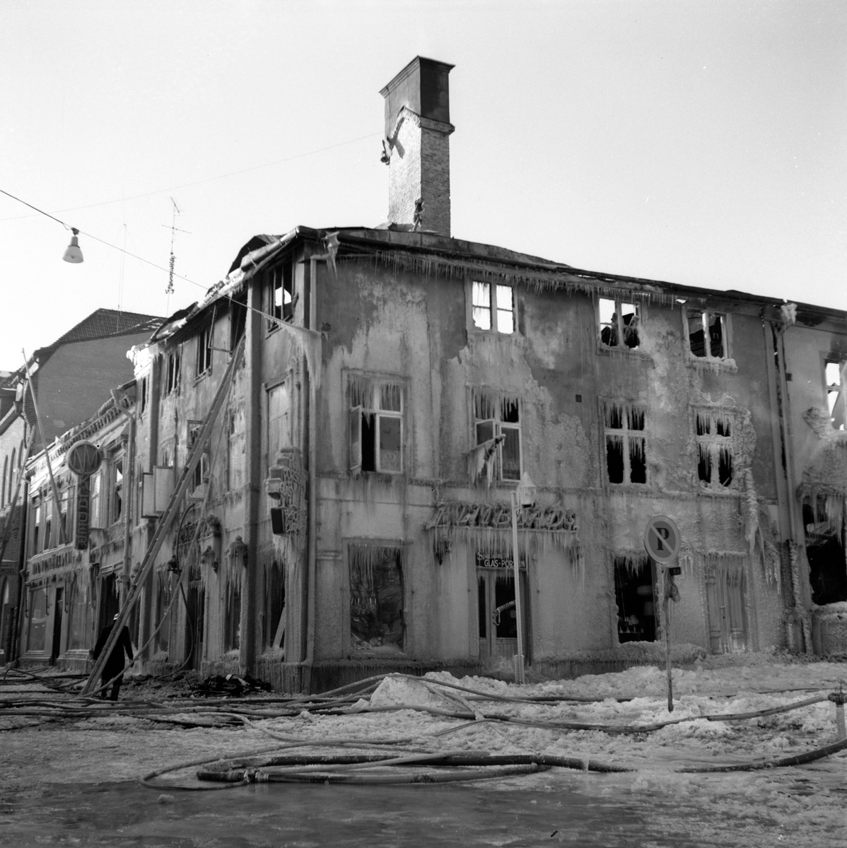 Branden i Elmblads Specialaffär Glas - Porslin vid Hovrättstorget i Jönköping, år 1965.