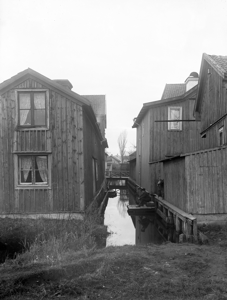 En kanal mellan husen i Jönköping. På trappan vid vattnet sitter en pojke och funderar.