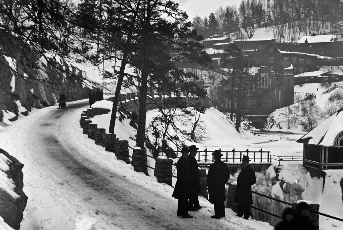 Ådalsvägen i Huskvarna, fyra män står i kröken vid dammen.
