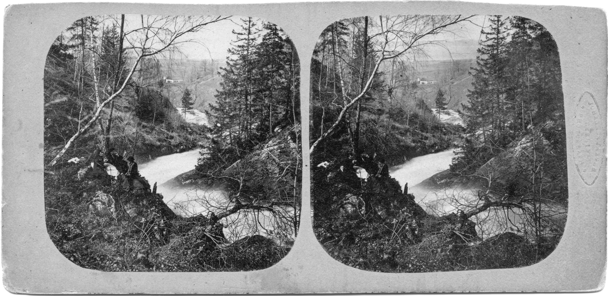 Tre män tar en paus vid Huskvarnafallen. Kapellet syns i fonden.