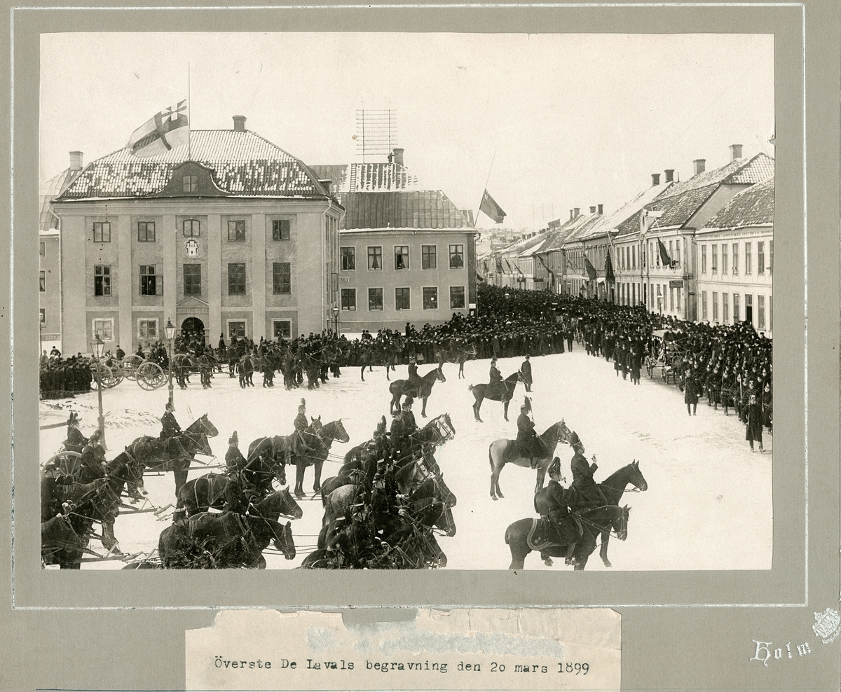Chefens för Kungliga Smålands artilleriregemente Överste Jaques de Laval jordafärd den 20/3 1899, passerar förbi Hovrättstorget. Kring likvagnen en hedersvakt av åtta kaptener Den anspända I divisionen har uppmarcherat på Hovrättstorget i Jönköping. Ett anspännt batteri och II divisionen till fots följer i processionen. Personalen är i storparad: attila med kartuch och knutskärp, kebby med plym. Hästarna ha valinappel, flaggorna hade då ännu unionsmärket.