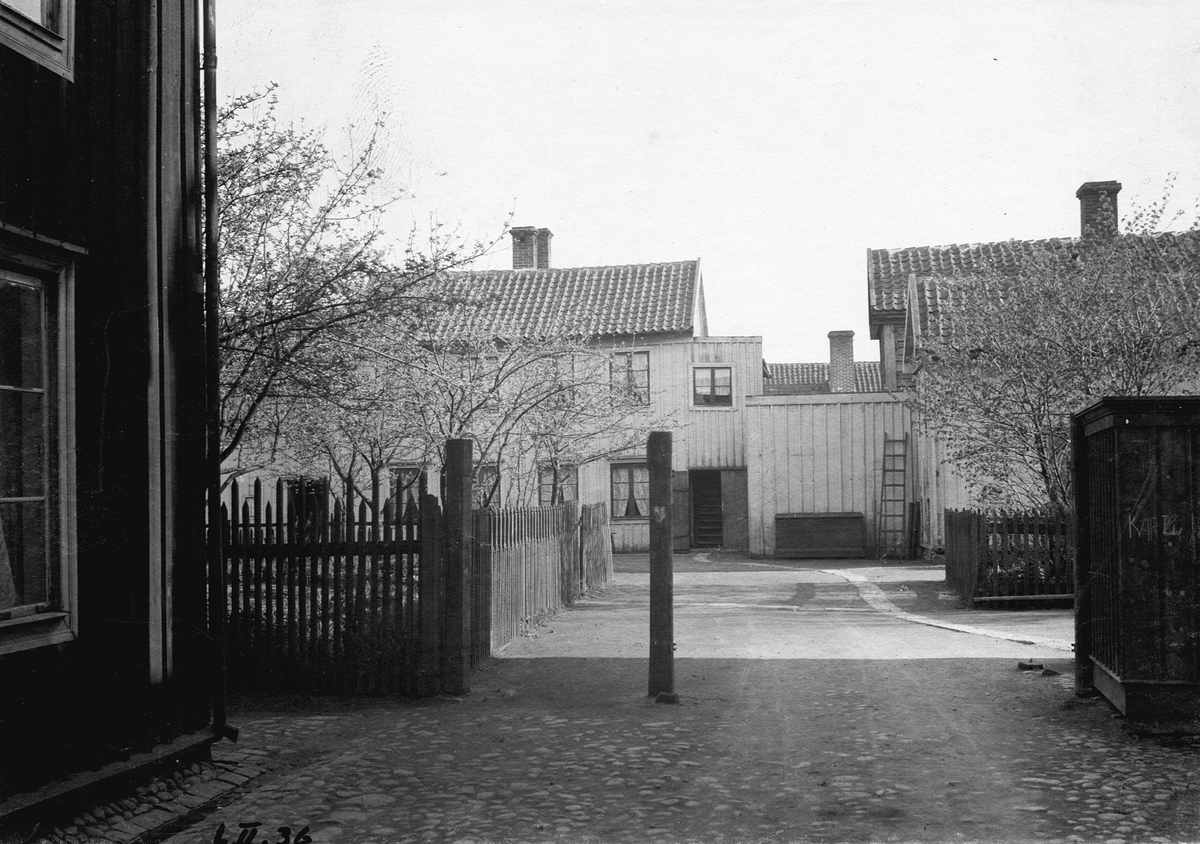 Missionsgränd mot söder, öster om Gamla missionshuset i Jönköping. I fonden syns delar av Nydala som ägdes av sjökapten A. E. Hellberg. Från höger kommer Odensgränd, senare Odengatan. Lägg märke till 1904 års klotter på planket till höger!