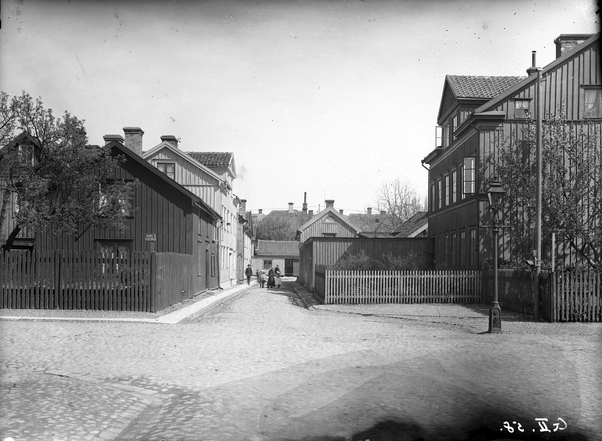 Hörnet Slottsgatan och Östra Holmgatan norrut i Jönköping. I bakgrunden syns Kanalgatan ungefär vid den punkt där kanalen vek av in i kvarteret till höger. Det högra huset hade adress Norra Fridhem och ägdes av snickarförman J. M. Magnusson. Tvärs över gatan låg Marieholm, vars ägare hette fröken E. Ch. Stark.