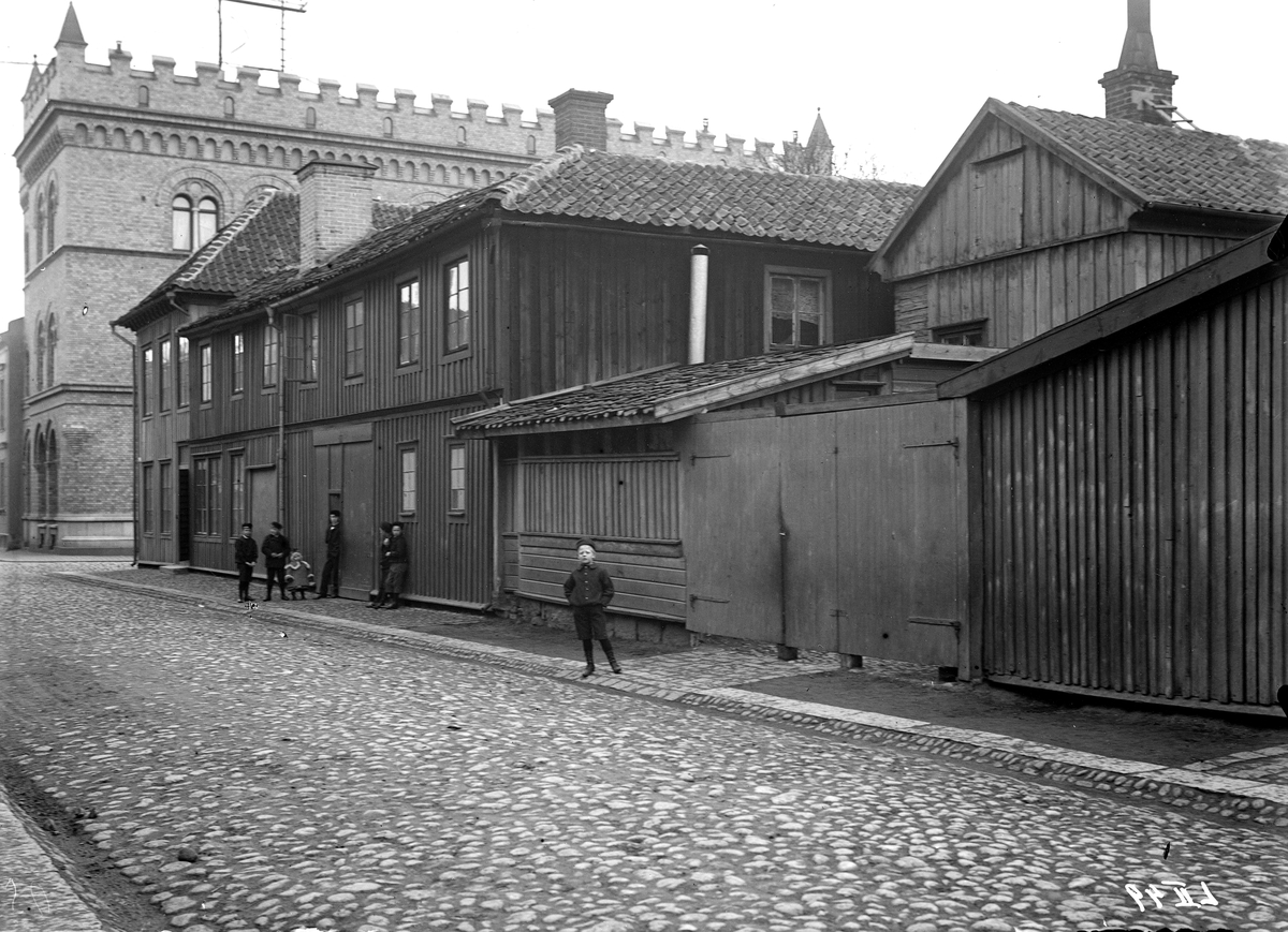 Västgötagatan nr 31 i Jönköping. Fastigheten till höger ägdes av bokhandlaren A. W. Olsson som drev Jönköpings Missionsbokhandel.