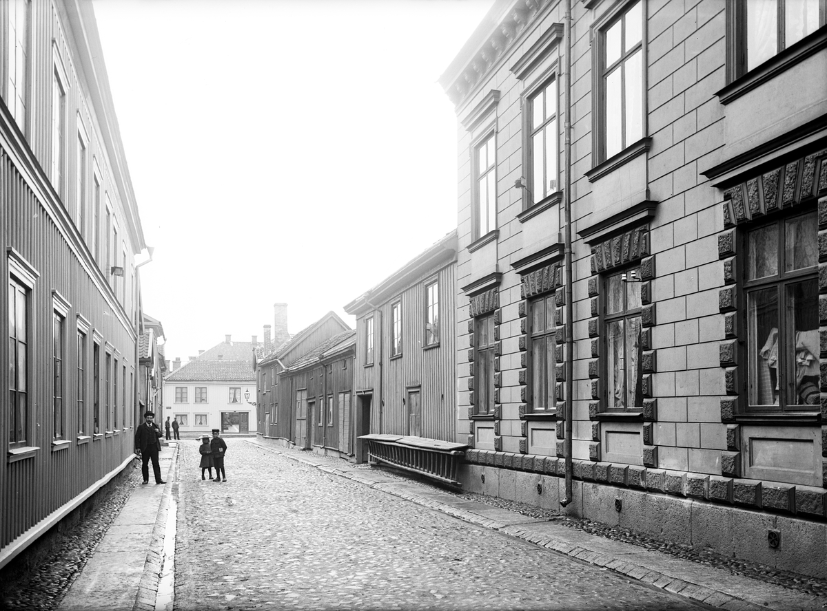 Fiskaregränd mot norr från Slottsgatan i Jönköping. Fiskaregränd är idag borta, men den låg mellan Änkhusgränd och Nya (Östra) Torget.