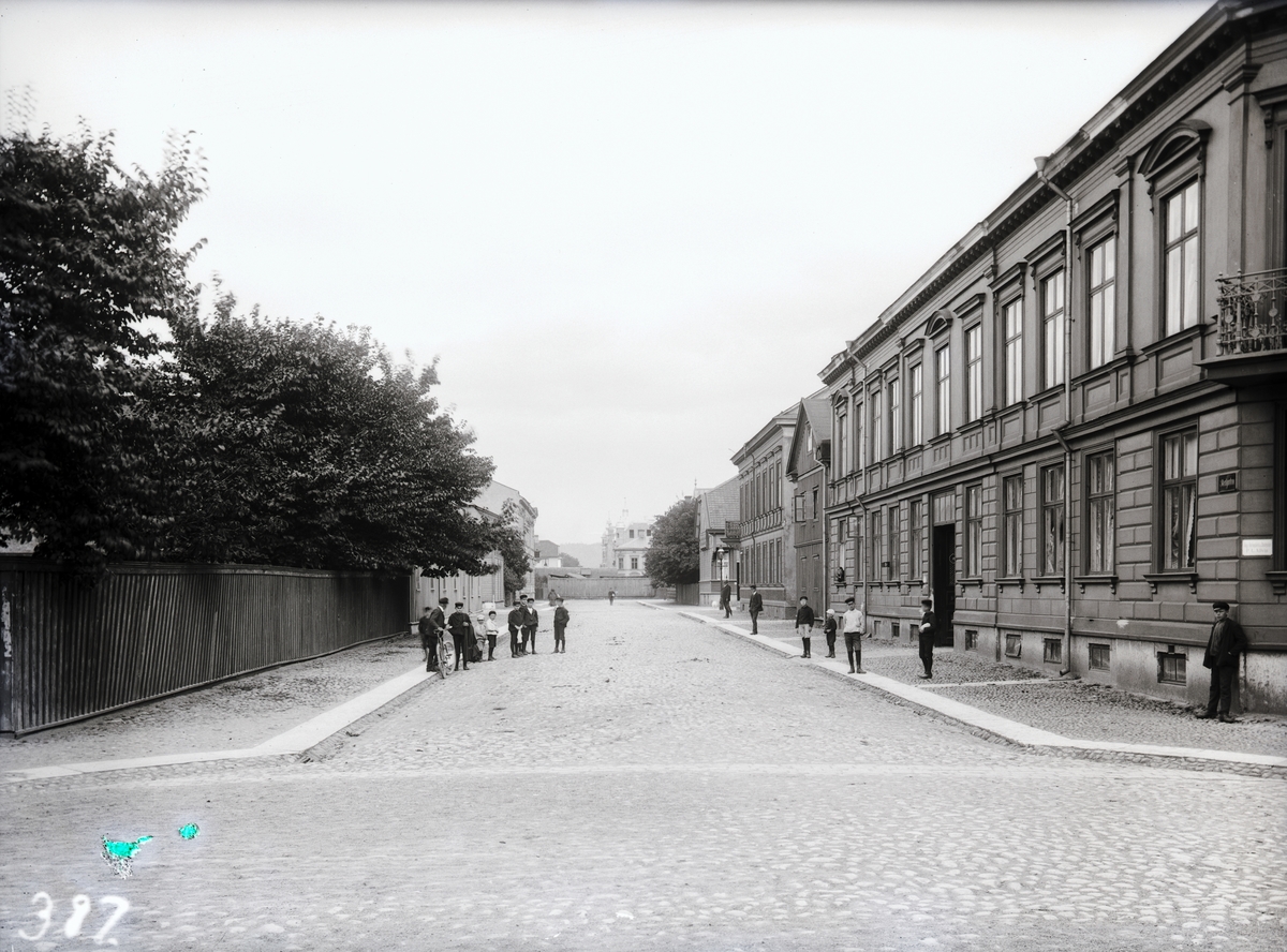 Skolgatan mot öster från Kapellgatan i Jönköping, innan Skolgatan lagts ut i sin hela längd 1918. Till vänster syns den obebyggda tomten med adress Västra Storgatan 25. Gatan blockerades av "Lilla Trädgård". Flera av byggnaderna finns ännu kvar år 2004.